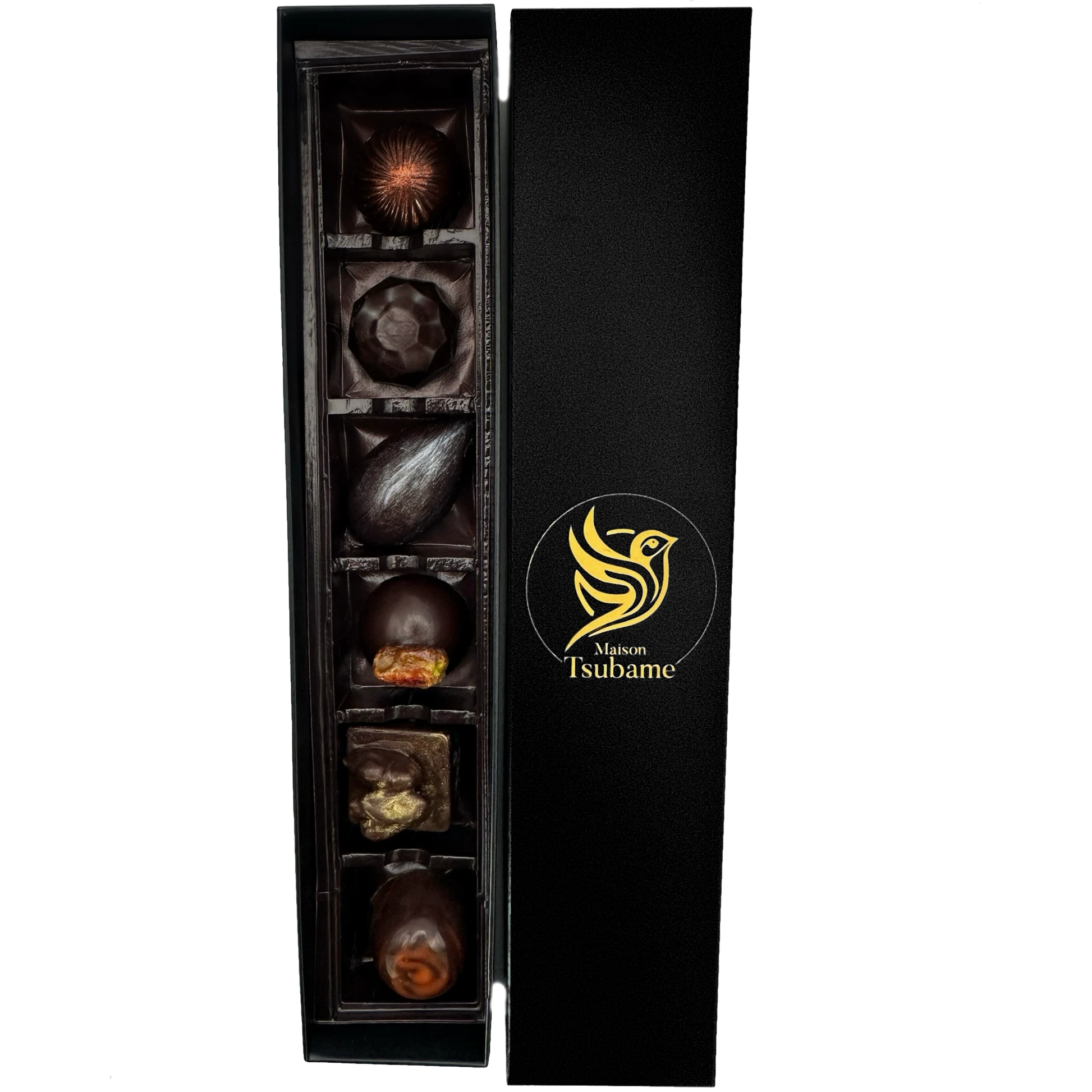 Experience an assortment of Maison Tsubame 6 signature handmade chocolates with a selection of dark and milk ganaches and pralinés.
